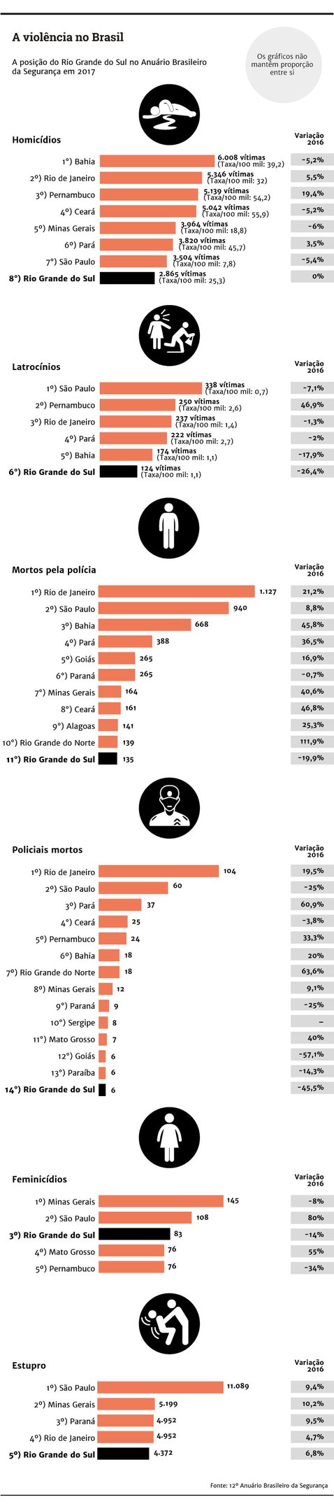 Em ao menos quatro indicadores de violência estudados pelo 12º Anuário Brasileiro de Segurança Pública, o RS teve queda de posição no ranking nacional, o que é considerado um resultado positivo, e em um manteve a mesma colocação. Entre os crimes que tiveram diminuição estão os latrocínios (roubos com morte).