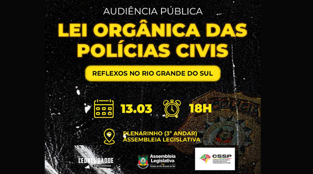 No dia 13 de março, às 18 horas, a Comissão de Segurança e Serviços Públicos da Assembleia Legislativa realizará uma Audiência Pública para debater a implantação da Lei Orgânica Nacional das Polícias Civis (LONPC) no Rio Grande do Sul. A audiência foi solicitada pela UGEIRM ao Presidente da Comissão, deputado estadual Leonel Radde, que prontamente se comprometeu com a mesma.