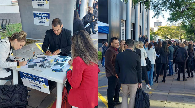 A direção do Sindicato montou a sua “barraca”, na frente do Palácio da Polícia, onde conversou com os (as) novos (as) policiais, explicando a importância do sindicato e convidando-os (as) a se filiarem à UGEIRM. Durante todo o dia, o movimento na barraca do Sindicato foi grande, com mais de 50 novos (as) policiais fazendo a sua filiação à UGEIRM.