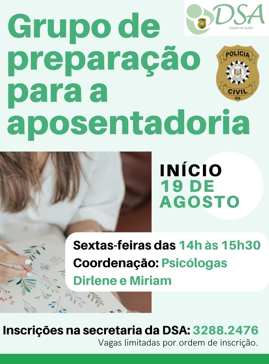 A Divisão de Saúde da Polícia Civil, abriu as inscrições para participação no Grupo de Preparação para a Aposentadoria. O Grupo desse ano está aberto para os (as) policiais que se aposentaram no período de 2020 a 2022, pois, devido à Pandemia do Coronavírus, o Grupo não acontecia desde 2019.