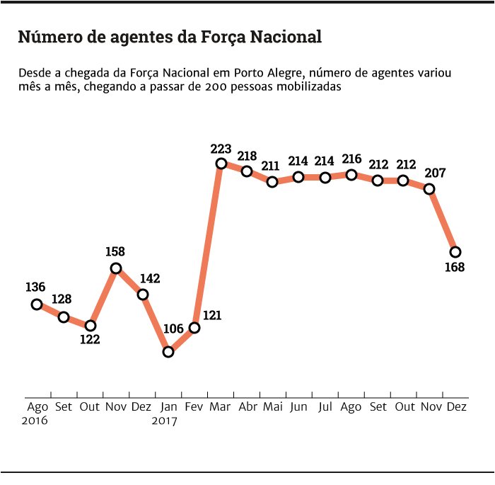 A presença da Força Nacional em Porto Alegre já custou mais de R$ 24 milhões para o governo federal, sem incluir a folha salarial do efetivo, paga pelos Estados de origem dos agentes. O valor foi utilizado para diárias, manutenção e abastecimento de viaturas e ainda para materiais de uso coletivo e individual. A despesa corresponde ao período de 26 de agosto de 2016, quando o contingente foi mobilizado para vir à Capital, até o final do ano passado.