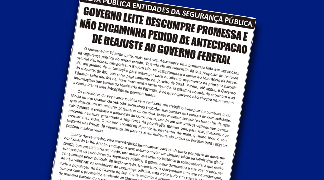 As entidades da Segurança Pública do RS emitiram, nesta quarta-feira (04), uma Nota Pública a respeito da postura do governo Eduardo Leite em relação à promessa de antecipação do pagamento da primeira parcela do reajuste salarial dos servidores da Segurança Pública.
