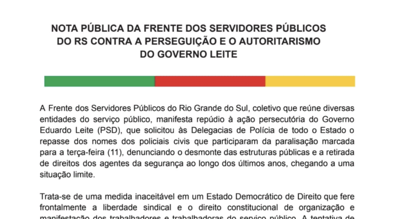 A Frente dos Servidores Públicos do Rio Grande do Sul, coletivo que reúne diversas entidades do serviço público, manifesta repúdio à ação persecutória do Governo Eduardo Leite (PSD), que solicitou às Delegacias de Polícia de todo o Estado o repasse dos nomes dos policiais civis que participaram da paralisação marcada para a terça-feira (11), denunciando o desmonte das estruturas públicas e a retirada de direitos dos agentes da segurança ao longo dos últimos anos, chegando a uma situação limite.