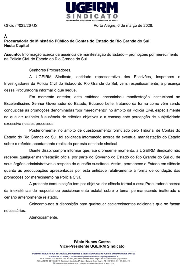A direção da UGEIRM recebeu, nesta quinta-feira (12), comunicação do Ministério Público de Contas do Estado do Rio Grande do Sul a respeito da representação apresentada pelo sindicato sobre irregularidades estruturais, persistentes e institucionalizadas nas promoções por merecimento da Polícia Civil do Rio Grande do Sul.