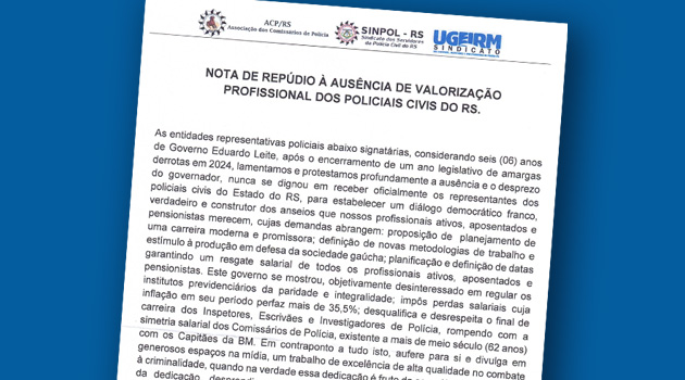 As três entidades que representam os (as) Agentes da Polícia Civil do RS (UGEIRM, Sinpol-RS e ACP-RS), divulgaram, nesta sexta-feira (20), uma Nota de Repúdio denunciando a falta de valorização dos (as) Policiais Civis, por parte do Governo Eduardo Leite.