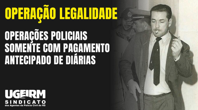 A primeira ação da UGEIRM para dar início à Operação Legalidade, é a exigência do pagamento antecipado das diárias, quando da convocação para participação em Operações Policiais. Esse é um direito garantido em lei, que muitas vezes não é cumprido pelo estado, causando sérias consequências para os policiais Civis, que precisam tirar dinheiro do próprio bolso para realizar o seu trabalho. Diante dessa realidade, a UGEIRM está orientando aos Policiais Civis que só participem de Operações Policiais com o pagamento antecipado das diárias correspondente.