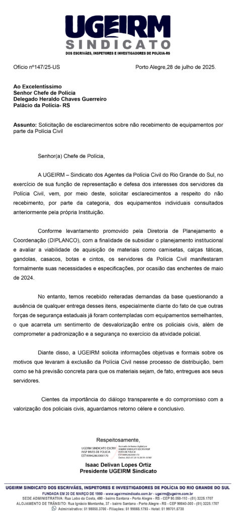 A direção da UGEIRM encaminhou um Ofício à Chefia de Polícia, questionando o motivo pelo qual os equipamentos individuais prometidos à categoria ainda não foram entregues. A solicitação tem como base um levantamento realizado pela Diretoria de Planejamento e Coordenação (DIPLANCO), que consultou os policiais civis em maio de 2024, logo após as enchentes que atingiram o estado, com o objetivo de subsidiar o planejamento institucional e avaliar a viabilidade de aquisição de itens como camisetas, calças táticas, gandolas, casacos, botas e cintos.