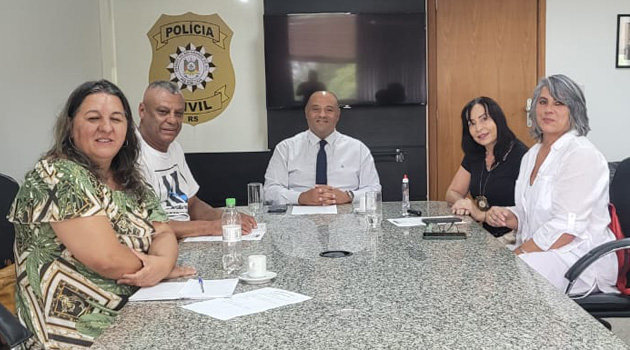 A direção da UGEIRM, representada pelo Presidente Isaac Ortiz e a 2ª Vice-presidente Neiva Carla Back, junto com as representantes dos policiais que aderiram ao Programa de Policiais Civis Aposentados (PCCA), Comissárias Cristiane Landvoigt e Marcia Betania, se reuniu nesta quinta-feira (06) com o Chefe de Polícia, Delegado Fernando Sodré. A reunião tratou de várias reivindicações relativas ao PPCA. O Programa foi criado em 2018 e permite que policiais civis aposentados realizem atividades como atendimento ao público, registro de ocorrências, serviços de informática, serviços cartorários, atividades de ensino e treinamento, condução de veículos oficiais, atividades de videomonitoramento e operações especializadas de segurança pública.