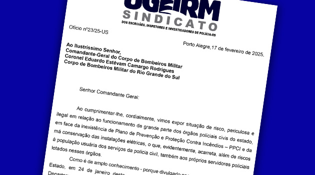 A direção da UGEIRM encaminhou, nesta terça-feira (18), ofícios ao Comandante-Geral do Corpo de Bombeiros Militar do RS e ao Subchefe da Defesa Civil do estado, requisitando providências urgentes, em relação aos sérios problemas verificados nos prédios da Polícia Civil. No documento, a direção do sindicato relata os casos recentes de problemas enfrentados pelos policiais civis, como os incêndios ocorridos no DEIC, por três dias seguidos, e o princípio de incêndio na 2ª Delegacia de Polícia de São Leopoldo, que foi combatido pelos próprios policiais civis.