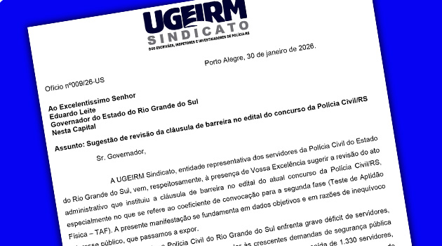 A direção da UGEIRM enviou ofício ao Governador Eduardo Leite solicitando a revisão da cláusula de barreira do atual concurso da Polícia Civil, especificamente do coeficiente de convocação para o Teste de Aptidão Física (TAF). O pedido tem como base o grave déficit de efetivo enfrentado pela instituição, que perdeu 1.330 servidores entre 2019 e 2025, em razão de aposentadorias e exonerações.