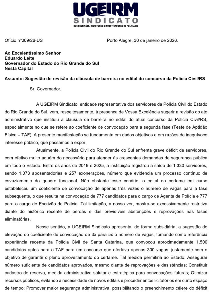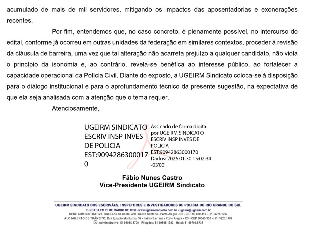 O Vice-presidente da UGEIRM, Fabio Castro, destaca que “a revisão da cláusula de barreira é juridicamente possível, não fere a isonomia entre candidatos e atende ao interesse público, ao fortalecer a capacidade operacional da Polícia Civil. Nós reafirmamos que estamos à disposição para o diálogo com a Secretaria de Segurança, caso necessário, para o aprofundamento técnico da proposta do sindicato”.